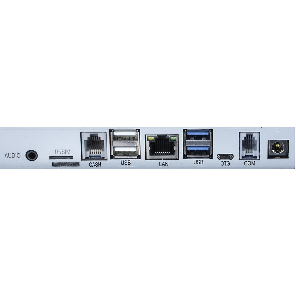 1 x USB HOST/OTG; 1 x RJ11 6P6C (Порт денежного ящика 12V); 1 x LAN; 1 x TF card slot; 6 x USB (2 х USB 3.0, 2 х USB2.0, 2 х USB внизу на стенде); 1 x Гарнитура; 1 x DC-12 В in; 1 х RJ11 4P4C (RS232 COM port – 5V); 2 х COM (внизу на стенде)